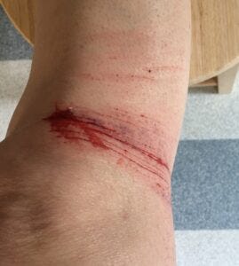 I took a spill the other day, stepping on a rogue pine cone and scraping my knee against a stump. Quite nasty-looking, plus a bruise and swelling. “Be a hero, Higgins,” I said out loud. “Get into that house and patch yourself up.”