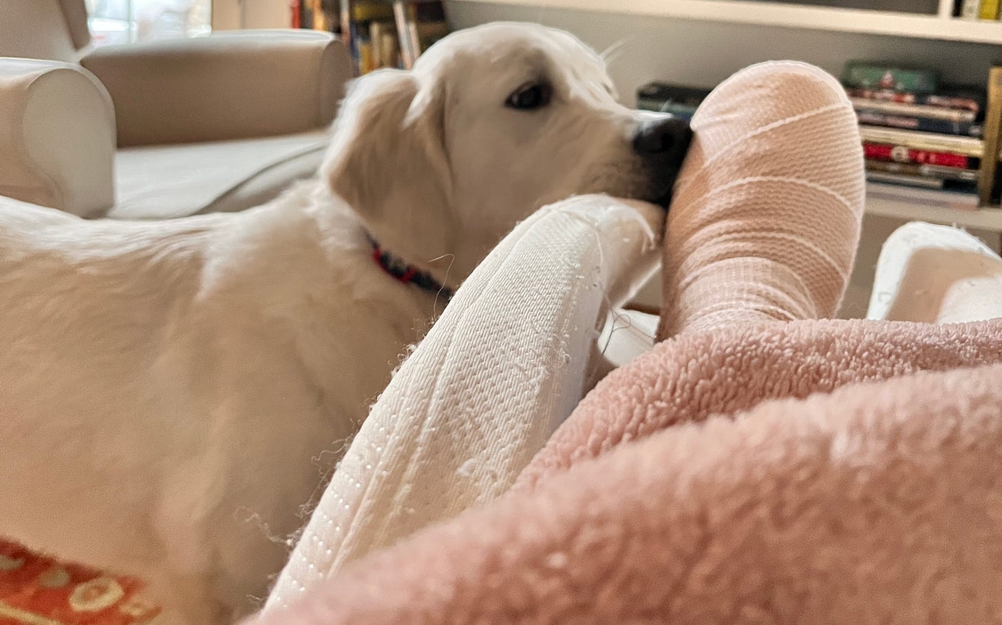 But it was mucho problemo. How would I get a cup of coffee to my chair? Was I supposed to stand in the kitchen, leaning against the counter, and drink it like an animal or something? How would I get a glass of water? Or dinner? McIrish had cruelly taken Buttercup with him, correctly imagining that a 60-pound puppy might not be the best companion for a woman on crutches, but also depriving me of the chance to teach her to fetch a bottle of wine from the fridge. Here she is, being a perfect and loving angel before McIrish stole her.